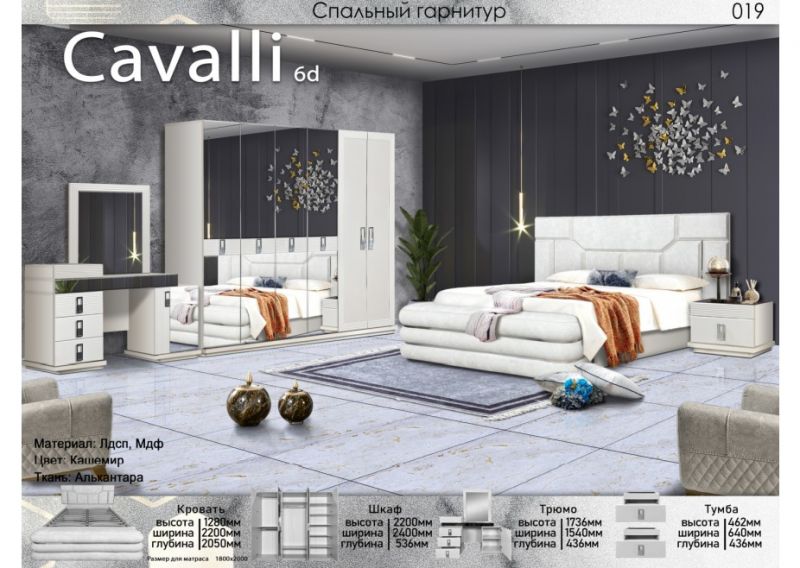 | Описание: | Элегантный и лаконичный спальный гарнитур Кавалли, созданный для тех, кто ценит комфорт, эстетику и функциональность. Гарнитур выполнен в спокойной светлой палитре: тёплый оттенок натурального дуба сочетается с белыми гладкими фасадами, визуально расширяя пространство и создавая атмосферу уюта и спокойствия. Шкаф 6-дверный: Ширина: 2400 мм Высота: 2200 мм Глубина: 536 мм 2. Кровать: Ширина: 2200 мм Высота: 1280 мм Глубина: 2050 мм 3.Тумба 2 шт: Ширина: 640 мм Высота: 462 мм Глубина: 436 мм 4. Трюмо: Ширина: 1540 мм Высота: 1736 мм Глубина: 436 мм Материал: МДФ, ЛДСП Цвет: Кашемир Размер матраса: 1800×2000 Без матраца. |