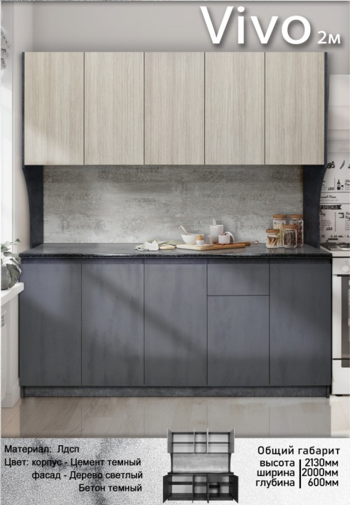 Кухонный гарнитур "Виво" (Vivo) 1,2 м, Цемент Темный/ Дерево Светлый, Elegant |