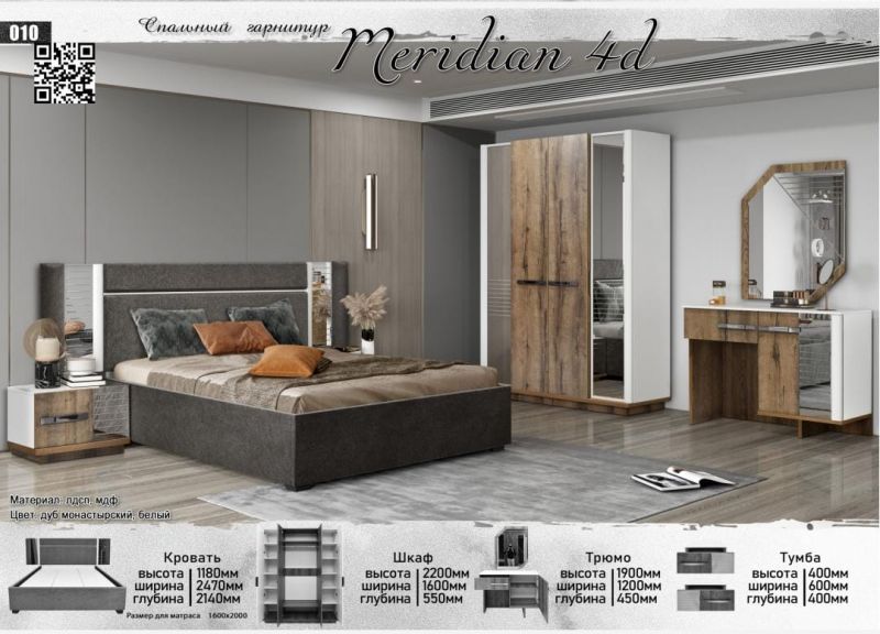 | Описание: | 1. Шкаф 4-дверный: Ширина: 1600 мм Высота: 2200мм Глубина: 550 мм 2. Кровать: Ширина: 2470 мм Высота: 1180 мм Глубина: 2140 мм 3.Тумба 2 шт: Ширина: 600мм Высота: 400 мм Глубина: 400 мм 4. Трюмо: Ширина: 1200 мм Высота: 1900мм Глубина: 450 мм Материал: МДФ, ЛДСП Цвет: Дуб монастырский белый/Цемент темный Размер матраса: 1600×2000 Без матраца. |