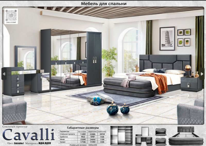 | Описание: | Кровать: 2200*1280*2450 Спальное место: 1800*2000 Тумба: 640*462*436 Туалетный столик: 1540*1736*436 Шкаф: 2400*2200*536 С основанием, без матраца. |