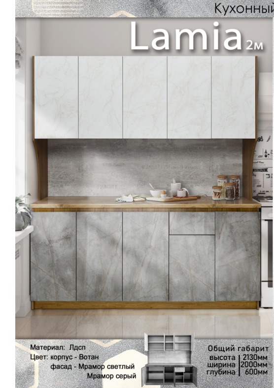 | Описание: | Высота - 2130 мм Ширина - 2000 мм Глубина- 600мм Материал - ЛДСП Цвет - Корпус Вотан Фасад - Мрамор/Серый Без мойки |