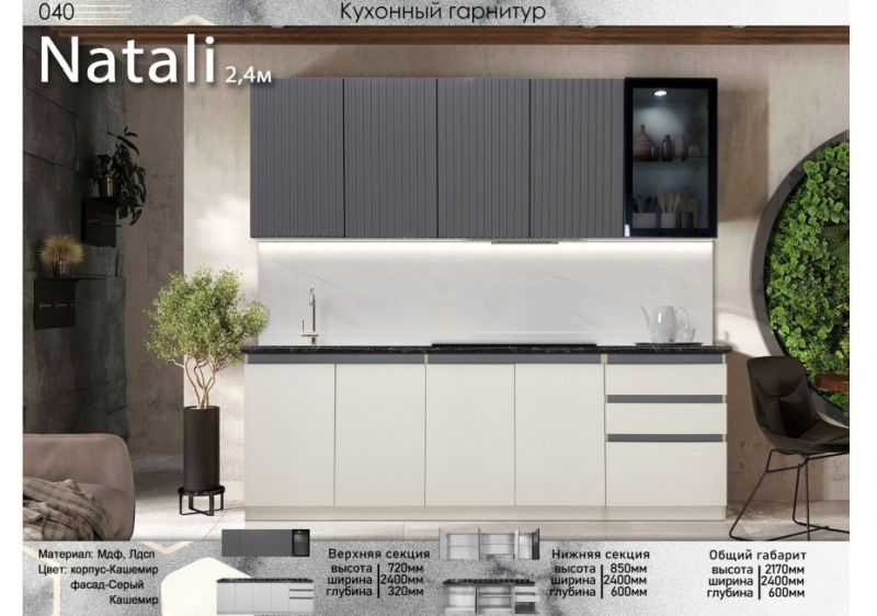 | Описание: | Высота - 2170 мм Ширина - 2400 мм Глубина- 600мм Верхняя секция: Высота - 720мм Ширина - 2400 мм Глубина- 320мм Нижняя секция: Высота - 850 мм Ширина - 2400 мм Глубина- 600мм Материал - ЛДСП Цвет - Корпус: Кашемир Фасад: Серый Мойка в комплекте. |