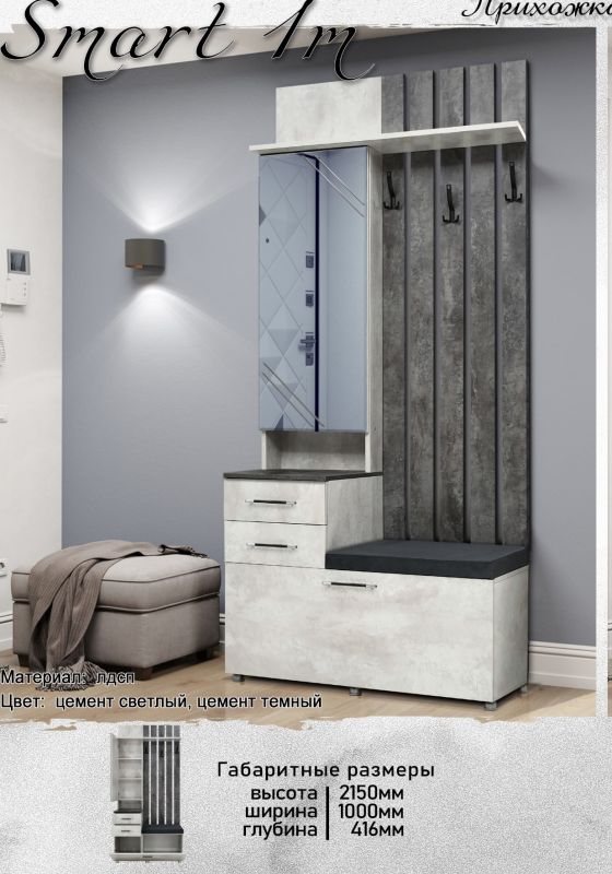 Прихожая "Смарт" 1 м Цемент темный/Сонома, Elegant |